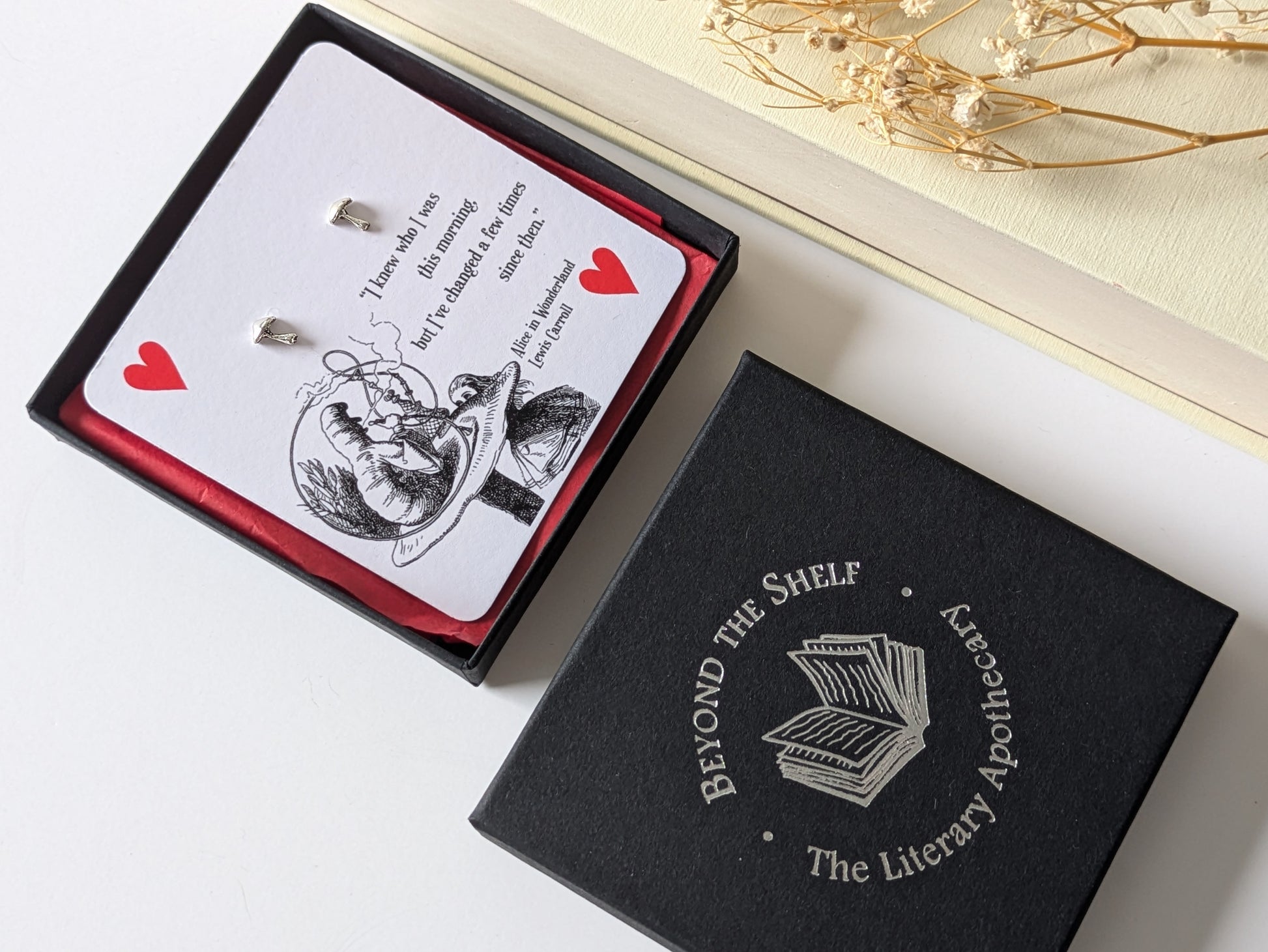 Beyond the Shelf jewellery is crafted from sterling silver, durable for long-lasting wear, and polished for an elegant finish. Our earrings are studs with post backs for a dainty look. Each jewellery piece arrives safely packed in our Beyond the Shelf gift box, mounted on a handmade backing board with our original literary designs; perfect for a unique gift that looks almost as good in the box as it will on you.