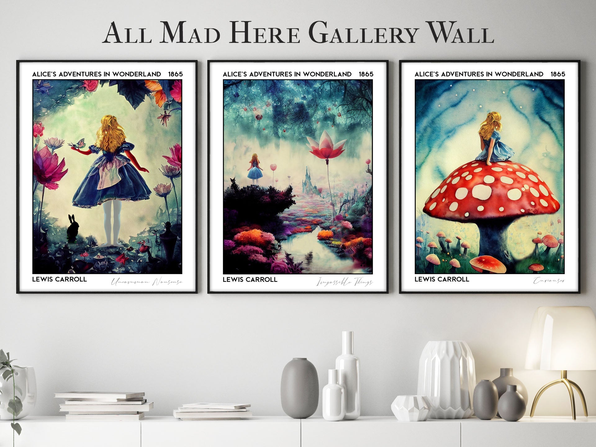 Our Alice's Adventures in Wonderland Gallery Wall Art Set evokes the childlike wonder of discovering something for the first time. The world is new, and has new rules that use a different logic. We let our imaginations run wild here! We use vibrant depictions of bright vibrant flowers and landscapes that are at once familiar and alien, eerie but beautiful.