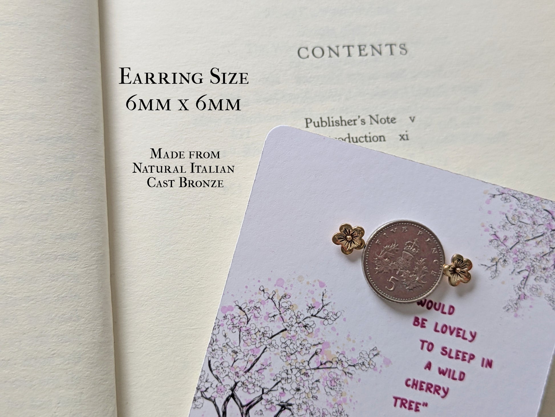 Revel in the blossom of spring with our cherry blossom earrings inspired by Anne of Green Gables. Crafted from natural Italian cast bronze, these blossoms are the epitome of spring and the burst of nature the season brings. Keen book lovers will notice this design is a nod to the Snow Queen, the cherry tree in the Green Gables garden.