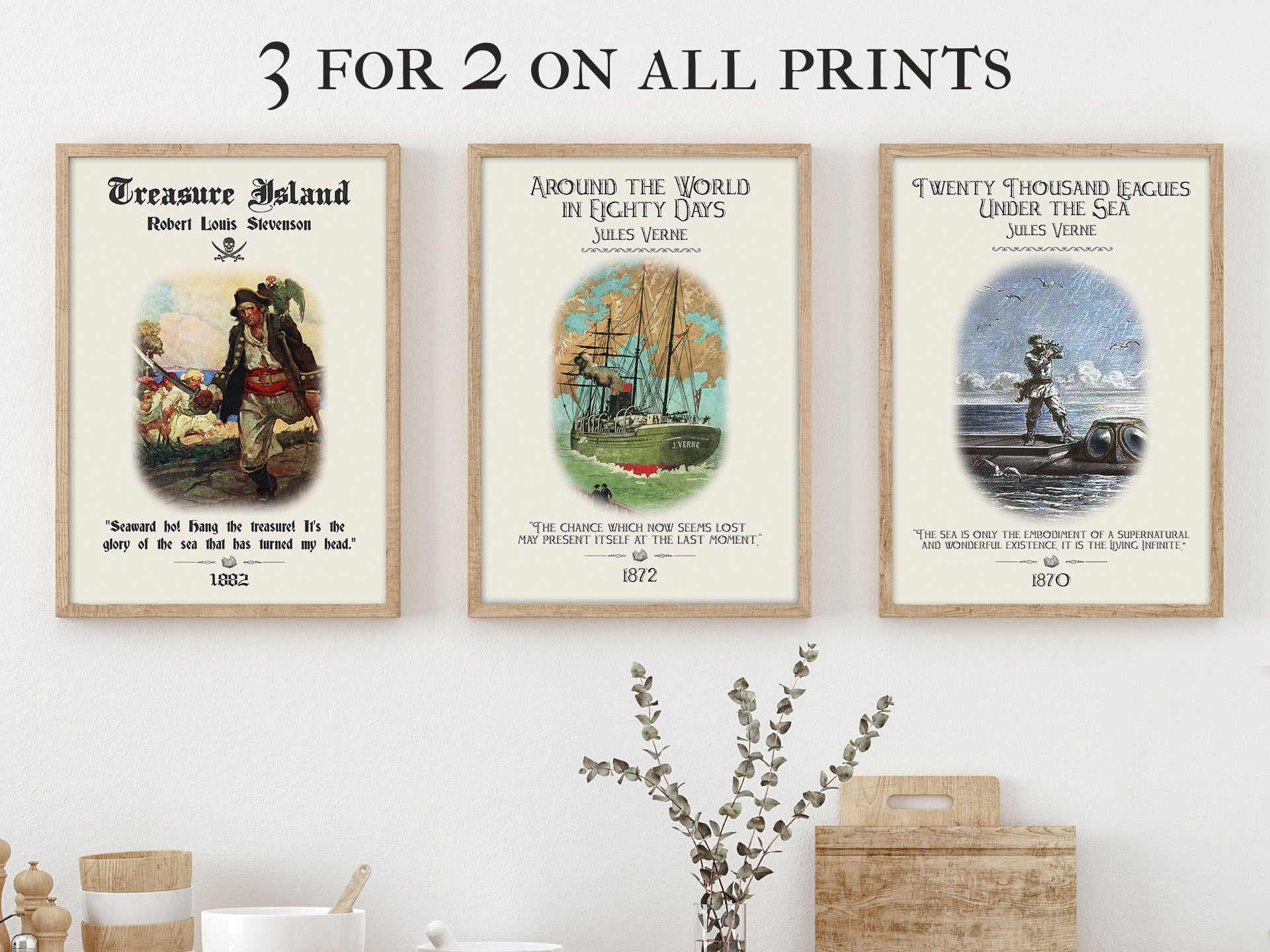 We wanted our bookish print to keep that spirit of adventure alive with a Jules Verne quote and nautical art from the original text to remind us that the possibility of adventure only requires us to set sail. This results in a vintage book poster perfect for readers and booklovers looking for literary gifts to curate an authentic bookish decor experience that stays true to the themes of this classic literature.