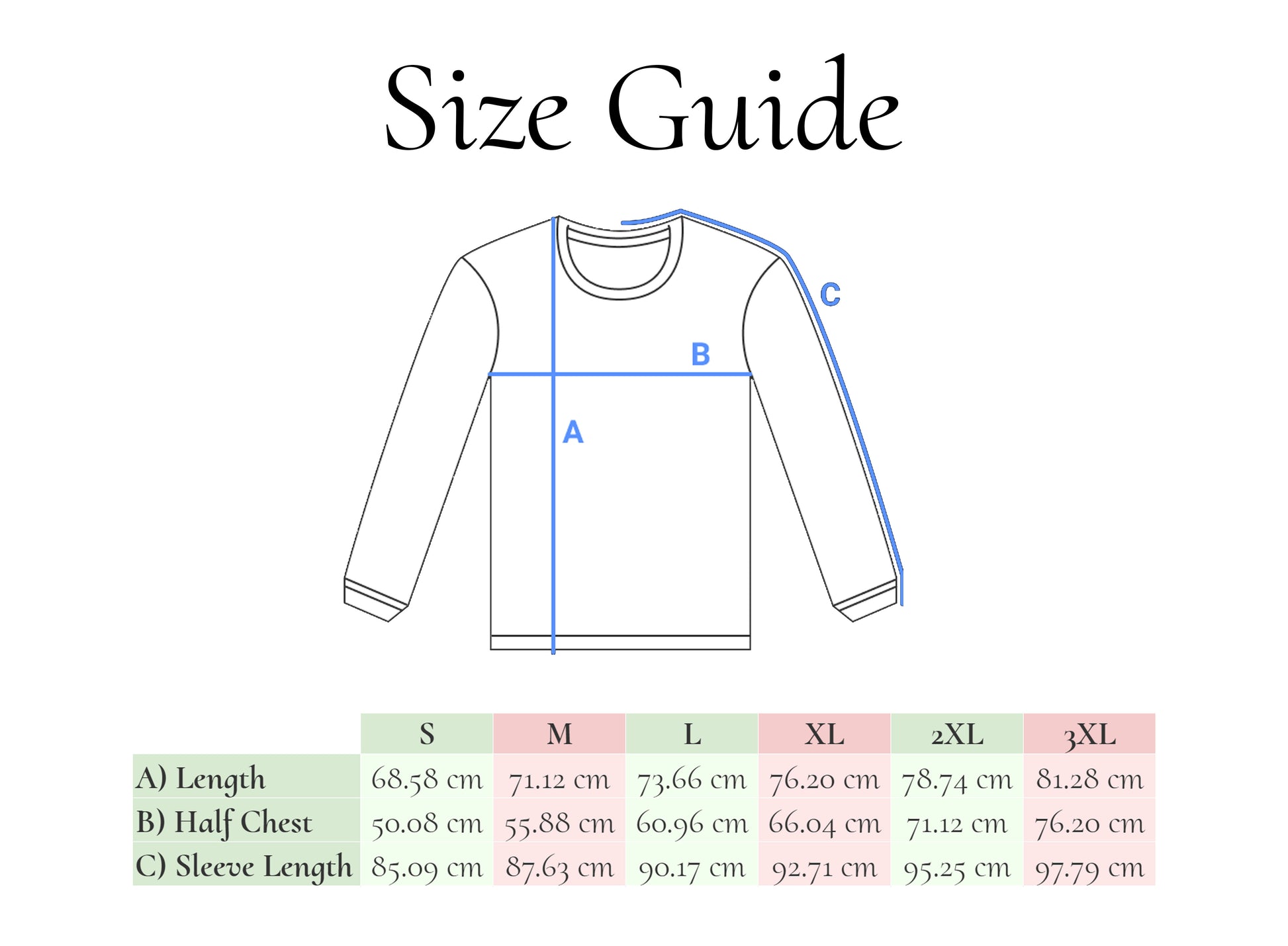 - 2XL: 78.74 cm body length, 71.12 cm chest width, 95.25 cm sleeve length