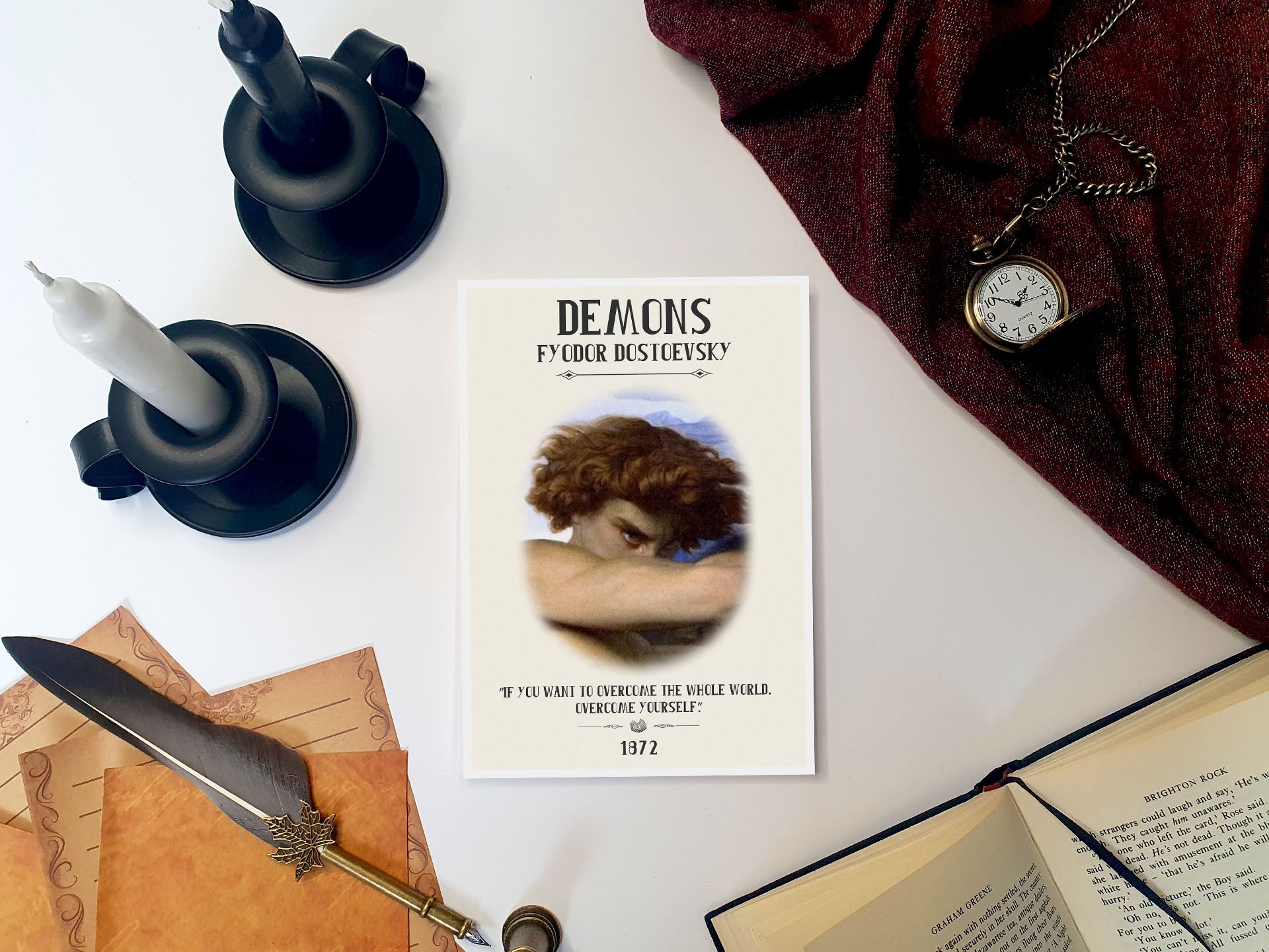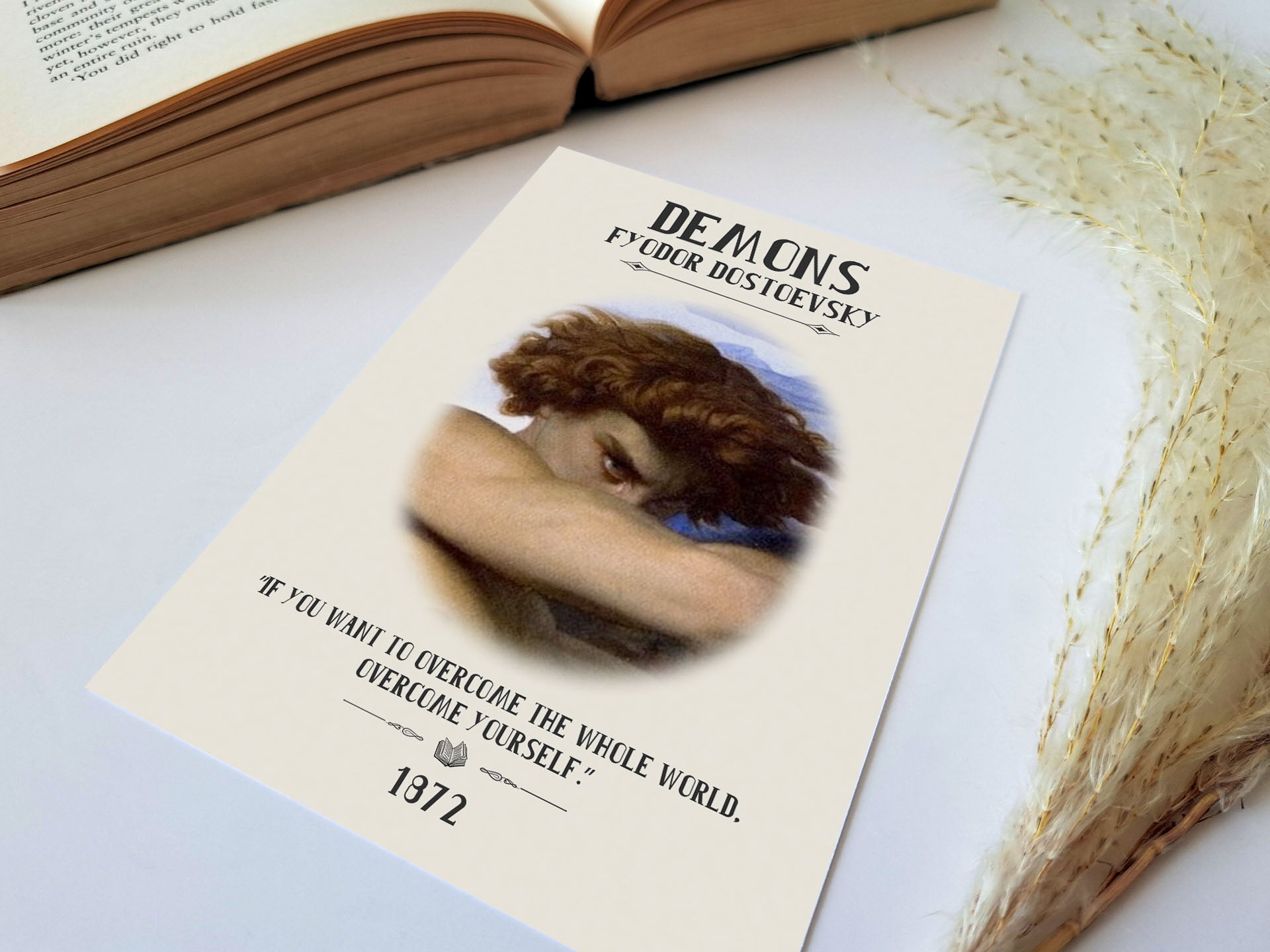 The Russian title, Bésy, translated as Demons, Possessed or Devils is beautifully vague in its ambiguity suggesting both people possessed by ideas as a supernatural force and Demons in human flesh possessing others with their ideas. Our literary print uses the more common Demons translation alongside the famous "Fallen Angel" artwork to build on the tragedy of the good intentions which often lead to possession by demons and resulting terrible action. Our chosen Dostoevsky quote reminds us to first understand our principles within ourselves before putting them out into the world. This results in a vintage book poster perfect for readers and booklovers looking for literary gifts to curate an authentic bookish decor experience that stays true to the themes of this literary classic.