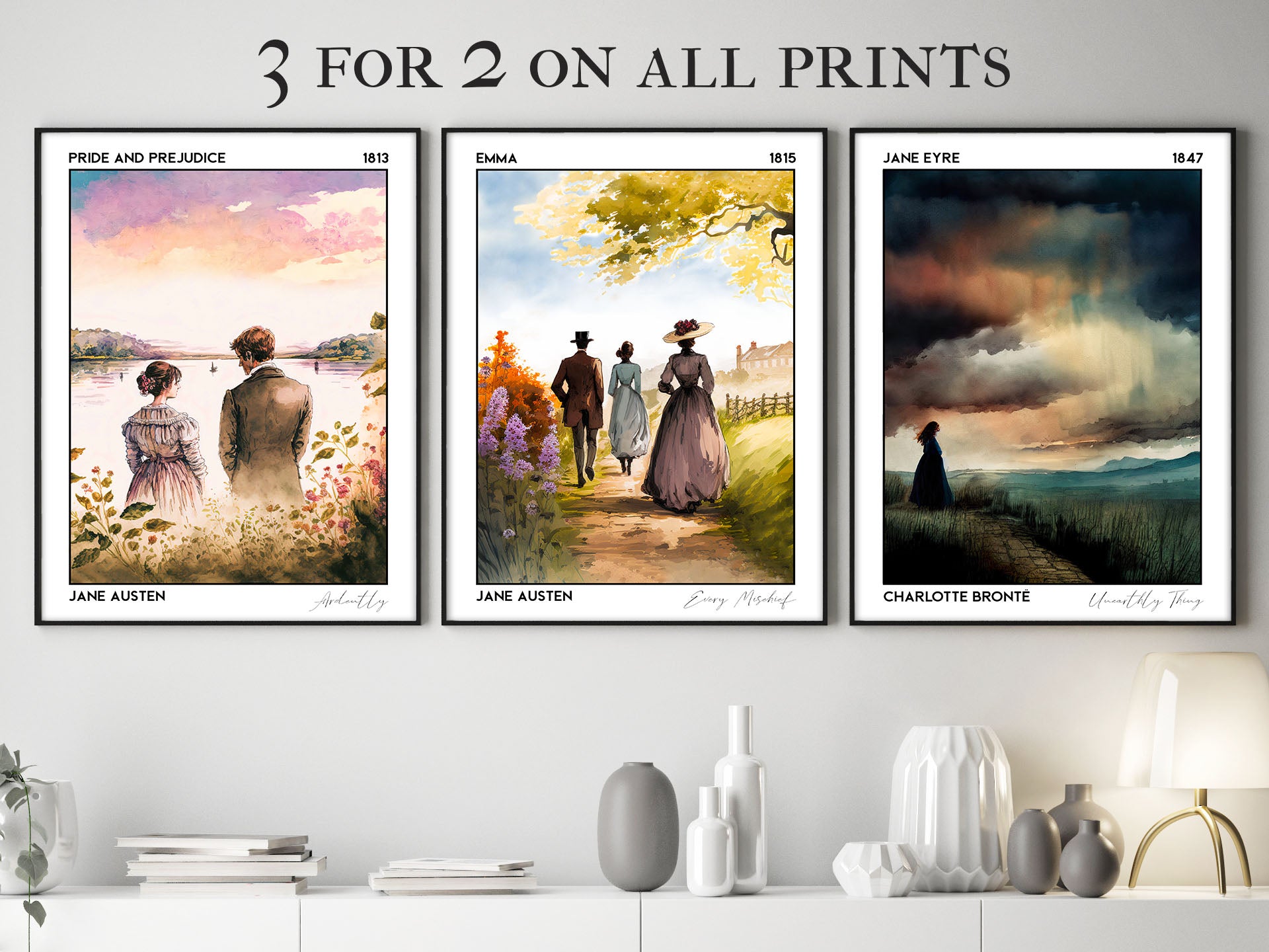 We fully lean into this sense of mischief in our bookish print. We see Emma stalking one of her latest matches in a picturesque English country walk. The beauty of the surroundings is in full bloom matched only by Emma's overconfidence in her own abilities. We wonder if Emma served as a warning for the author, to make sure her characters do indeed belong together before using a story to push them together. This results in a vintage book poster perfect for readers and book lovers looking for Jane Austen gifts to curate an authentic bookish decor experience that stays true to the themes of this classic literature.