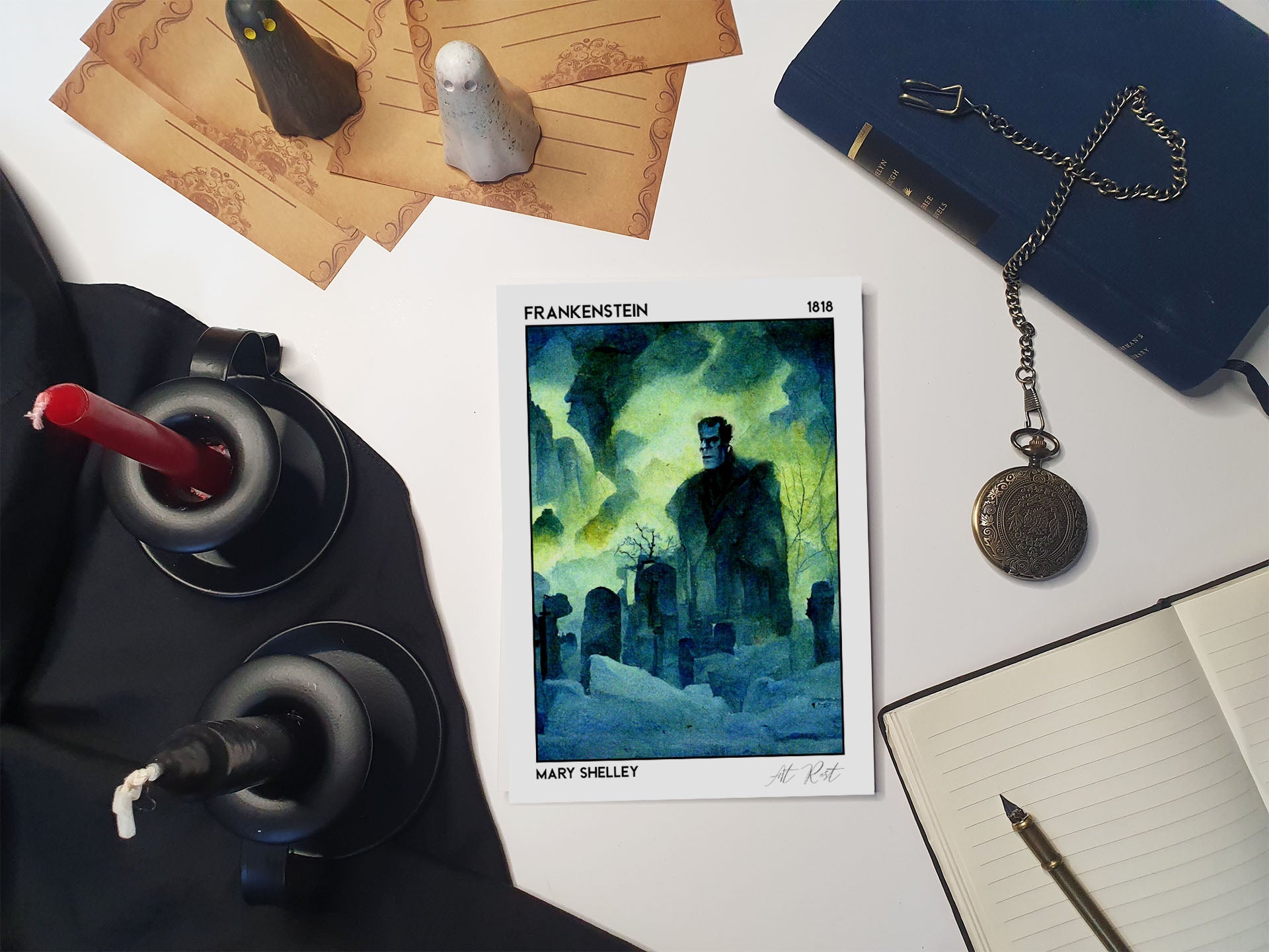In this book poster, we see the monster contemplate mortality. He at once towers over and becomes one with the graveyard in a classic electric green mist. This results in a whimsical goth decor perfect for readers and book lovers looking for literary gifts to curate an authentic bookish gothic decor experience that stays true to the themes of this literary classic.