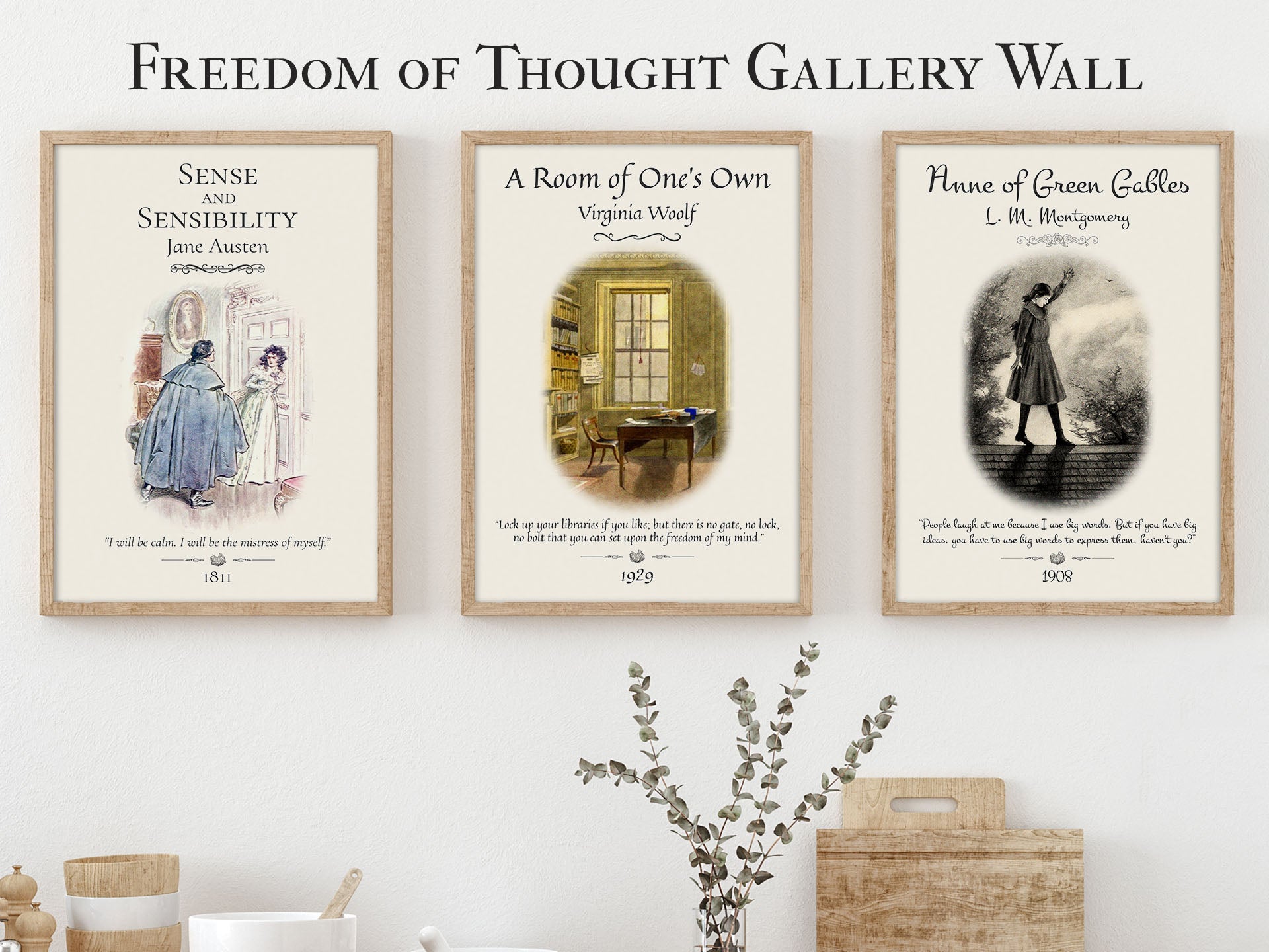 Our Freedom of Thought Gallery Wall Art Set evokes the arduous carving out of space for expression. We use the building of one's own space in A Room of One's Own, the recognition of words as tools of expression of Anne of Green Gables, and the strength to give voice to one's ideas.