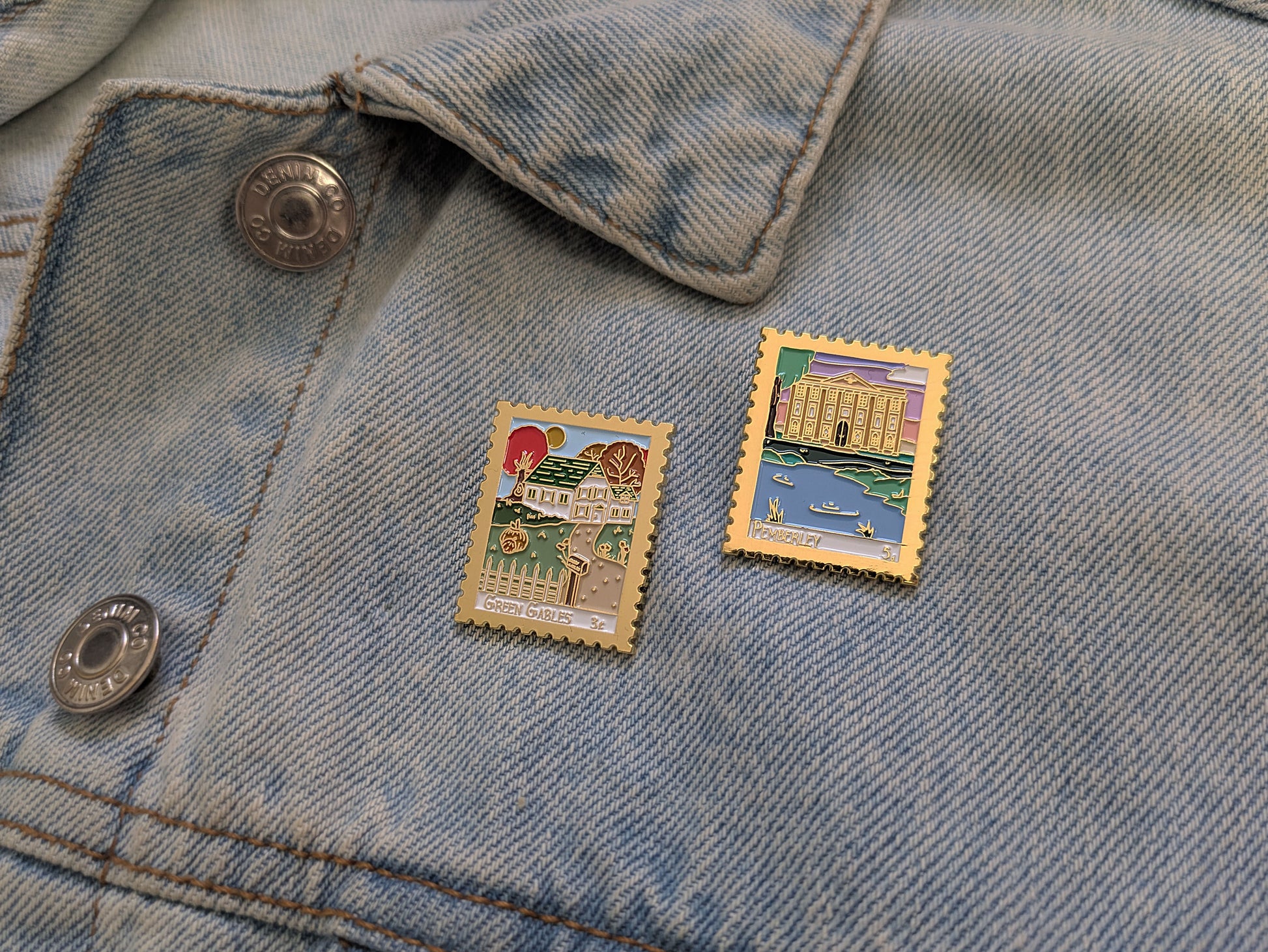 Our postage stamp souvenir pin from the impressive estate of Pemberley aims to capture the beauty of the location that Austen describes in Pride and Prejudice.