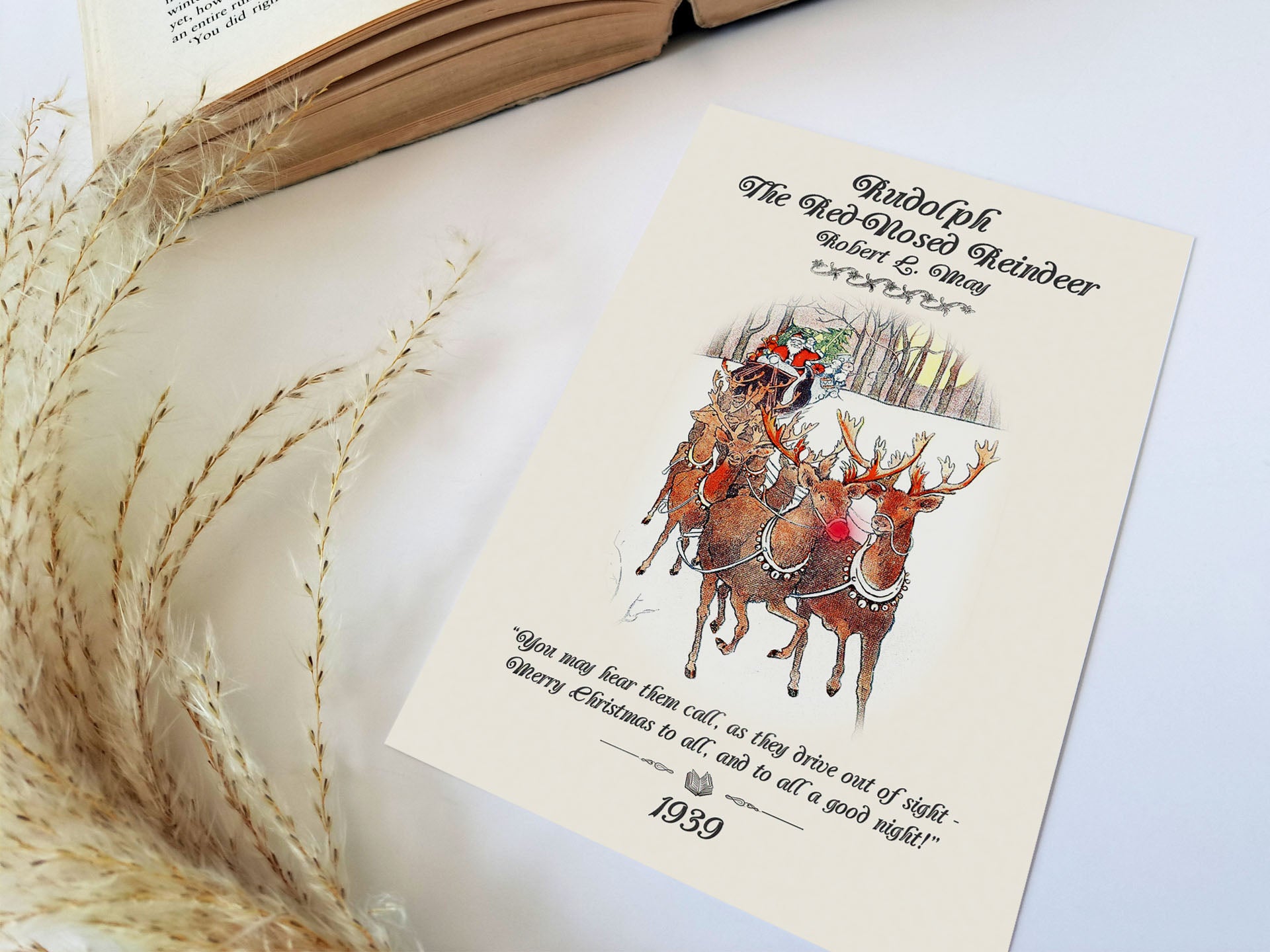 We wanted our bookish print to capture that classic scene: Rudolph putting his talents to work leading his reindeer team to a successful Merry Christmas.This results in a vintage book poster perfect for readers, book, and animal lovers looking for literary gifts to curate an authentic bookish Christmas decor experience that stays true to the themes of this classic literature.