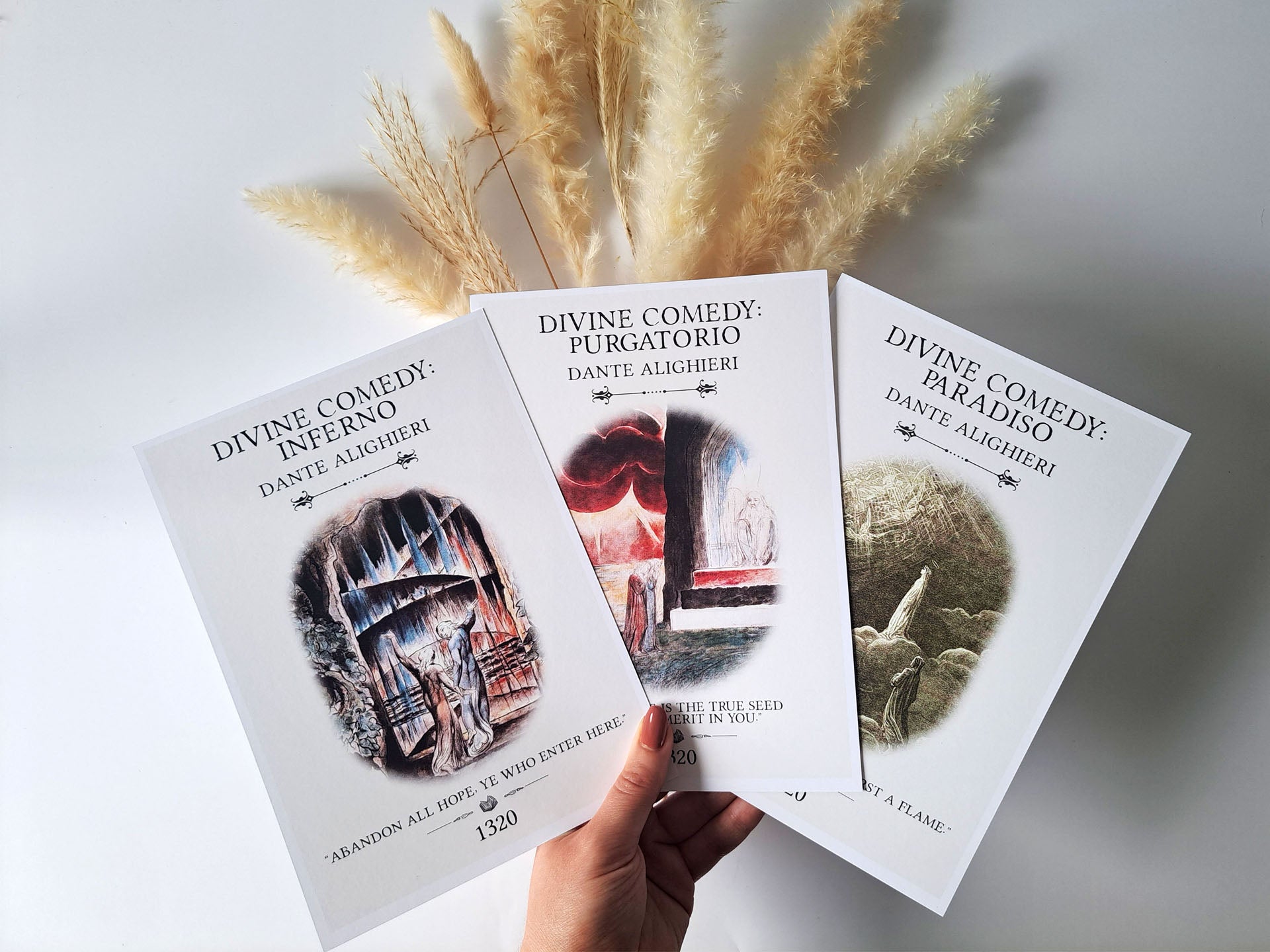 Our Divine Gallery Wall Set evokes the illumination only possible when travelling through the three realms of the dead. We use Dante's Inferno, Purgatorio, and Paradiso alongside William Blake and Gustav Doré artwork.