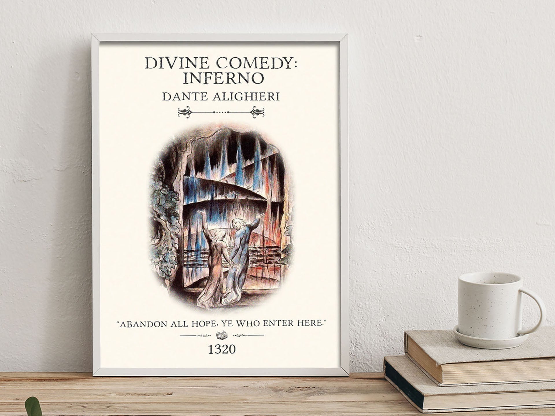 Our Divine Comedy Gallery Wall Set draws on famous quotes and uses both William Blake and Gustav Doré artwork to create a Divine Comedy collection that is both faithful to its rich history and speaks to contemporary audiences. From the towering gates of Inferno, the tender passions of Purgatorio, and the peaceful bliss of Paradiso. This results in a celebration of humanity with the power of free will which can both damn and give eternal bliss for eternity.They are literary posters faithful to the themes of these literary classics and perfect for readers and book lovers looking for literary gifts to curate an authentic bookish decor. They are a reminder that lifeand deeds are a huge responsibility.