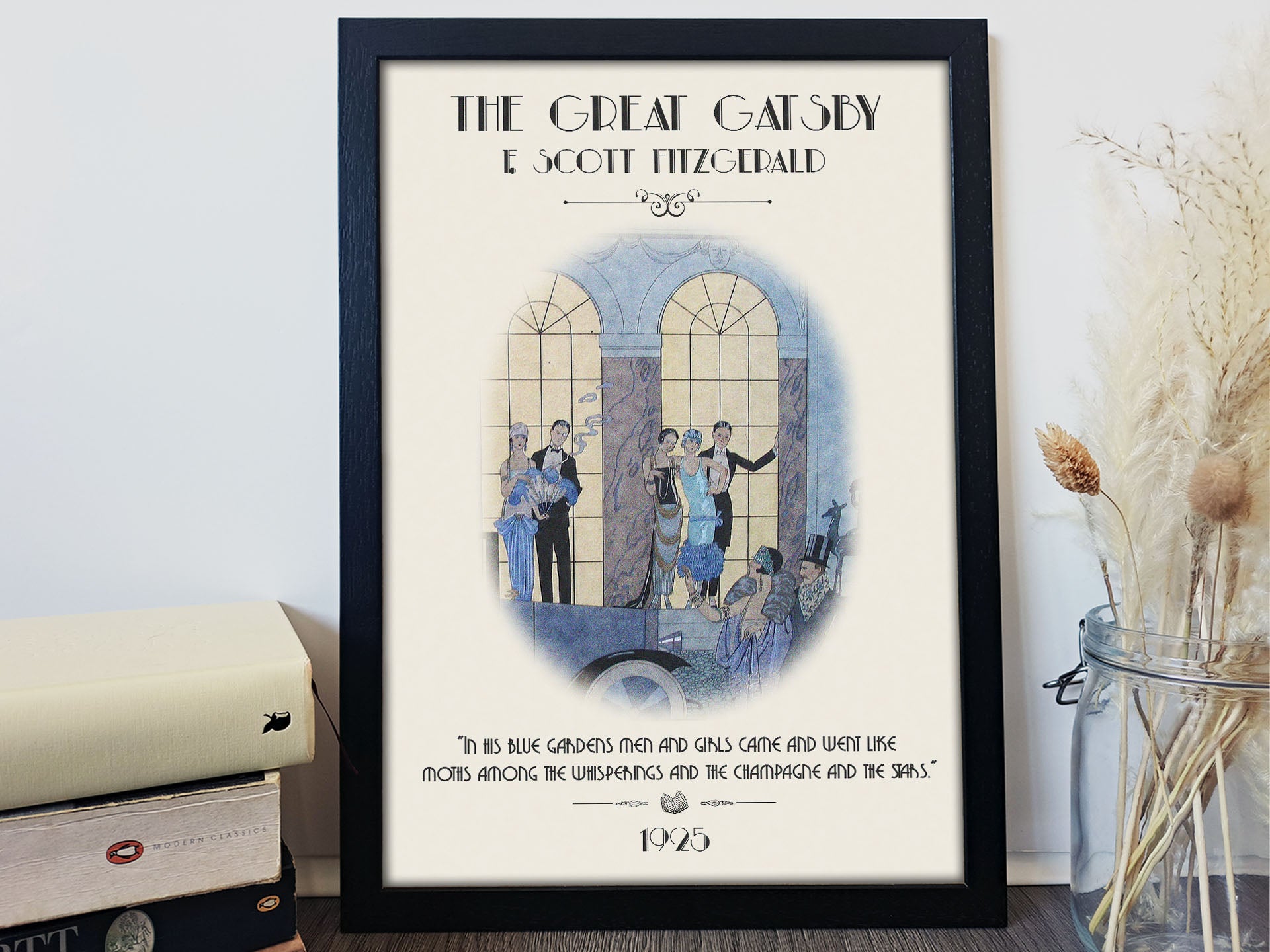 Our bookish print uses colour to express the emptiness at the heart of the story. Our The Great Gatsby quote likens the guests to moths to a light - seeking protection in the movement of champagne and whispers in the night from the dreariness of their daily concerns. Our art deco illustration shows the guests, like Gatsby, cannot escape the blue emptiness they attempt to hide from. As the book shows, these people with everything are their own worst enemies and are consumed by status. This results in a vintage book poster perfect for readers and book lovers looking for literary gifts to curate an authentic bookish decor experience that stays true to the themes of this classic literature.