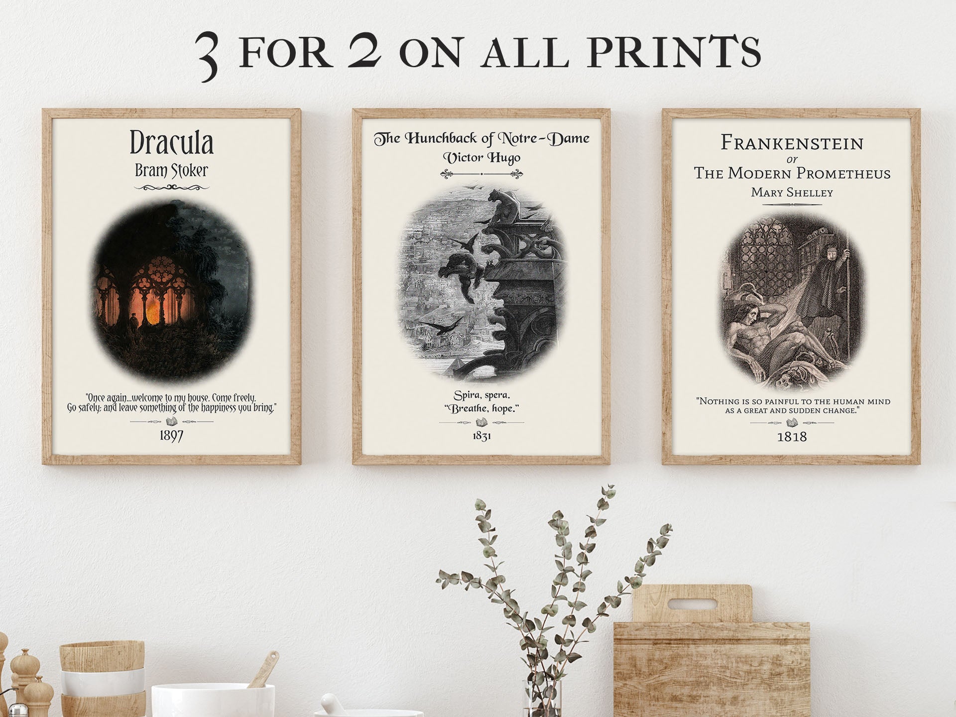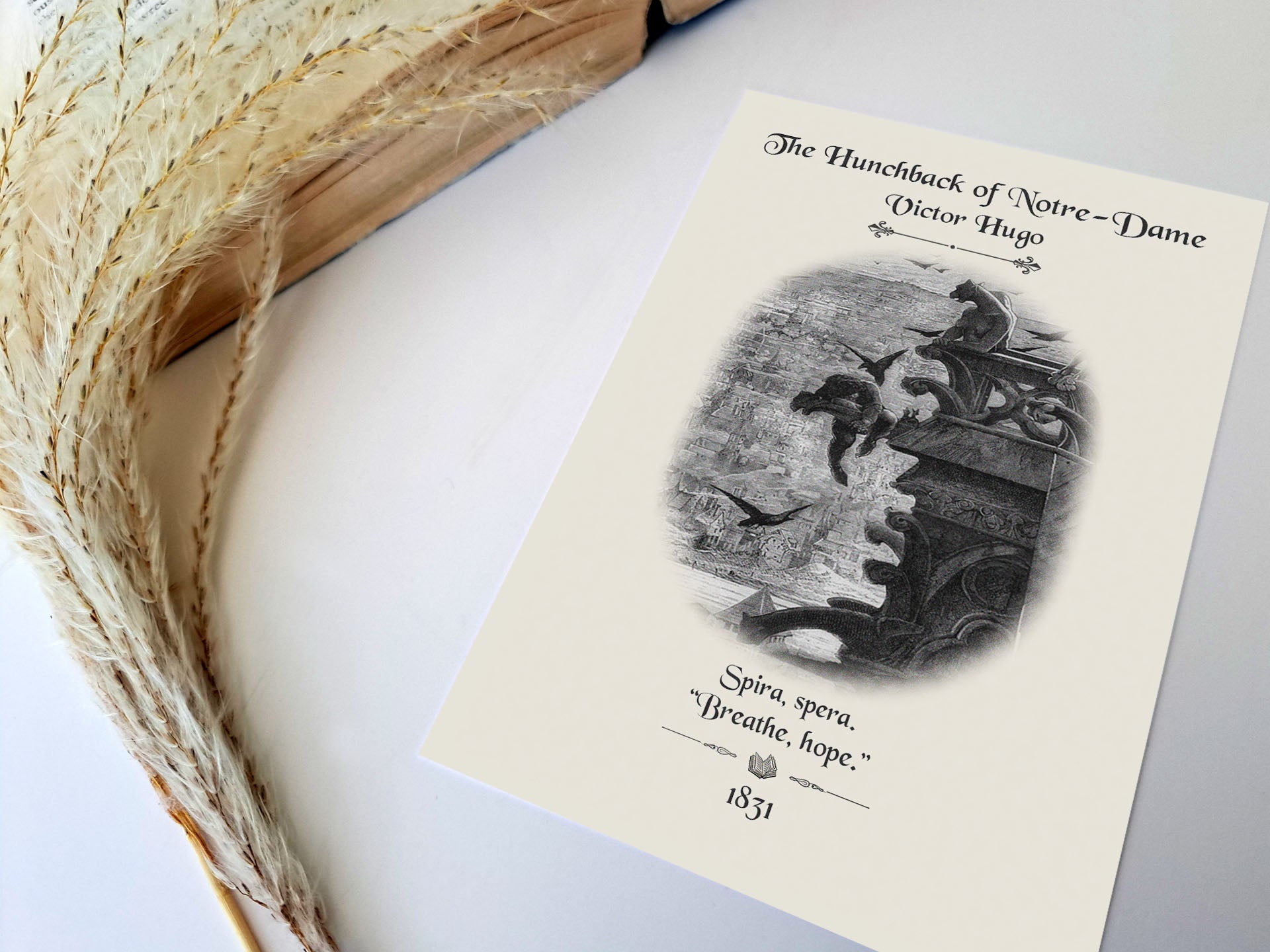 Our bookish print aims to capture the original's much darker ending than later more widely known adaptations. We used gothic art showing the architecture Hugo hoped to preserve in his writing. Our chosen Hunchback of Notre-Dame quote demonstrates the need for hope against overwhelming odds also present in this classic literature. This results in a vintage book poster perfect for readers and book lovers looking for literary gifts to curate an authentic bookish decor experience that stays true to the themes of this literary classic.