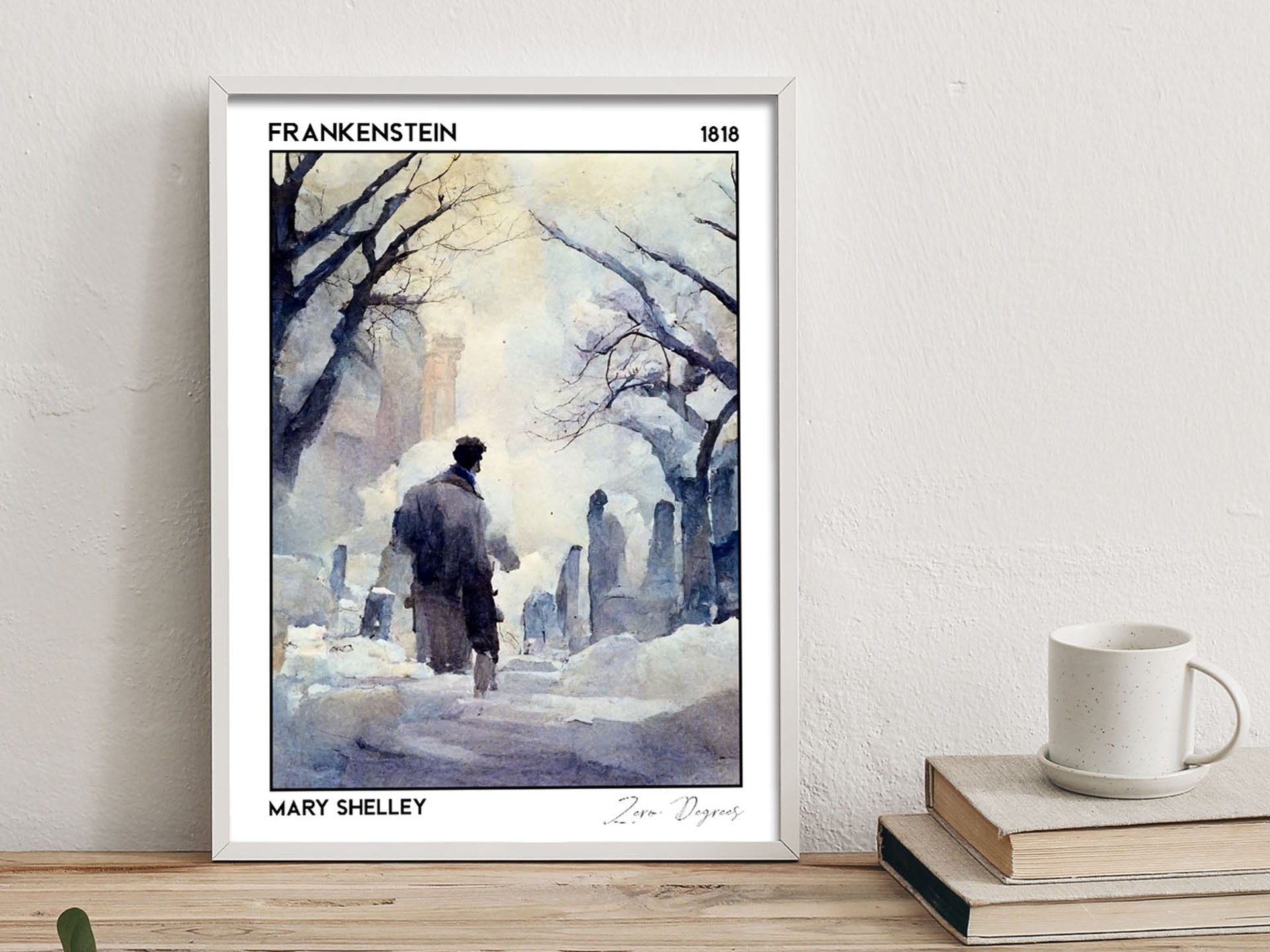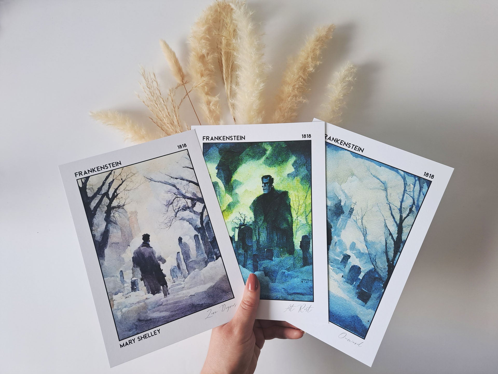 Our Frankenstein Gallery Wall Set tells the story at the centre of the original work, (the impossibility) of finding one’s purpose. The monster searches for answers and stumbles across a graveyard. Reflecting on his place in the world he comes to an unknown conclusion. He then moves with resolve and dominates the previously oppressive arctic landscape having gathered a sense of meaning through contemplation. This results in a celebration of romantic-gothic decor more optimistic than the original Frankenstein story whilst retaining the original's darker themes. It is perfect for readers and book lovers looking for literary gifts to curate an authentic bookish gothic decor experience that stays true to the themes of this literary classic.