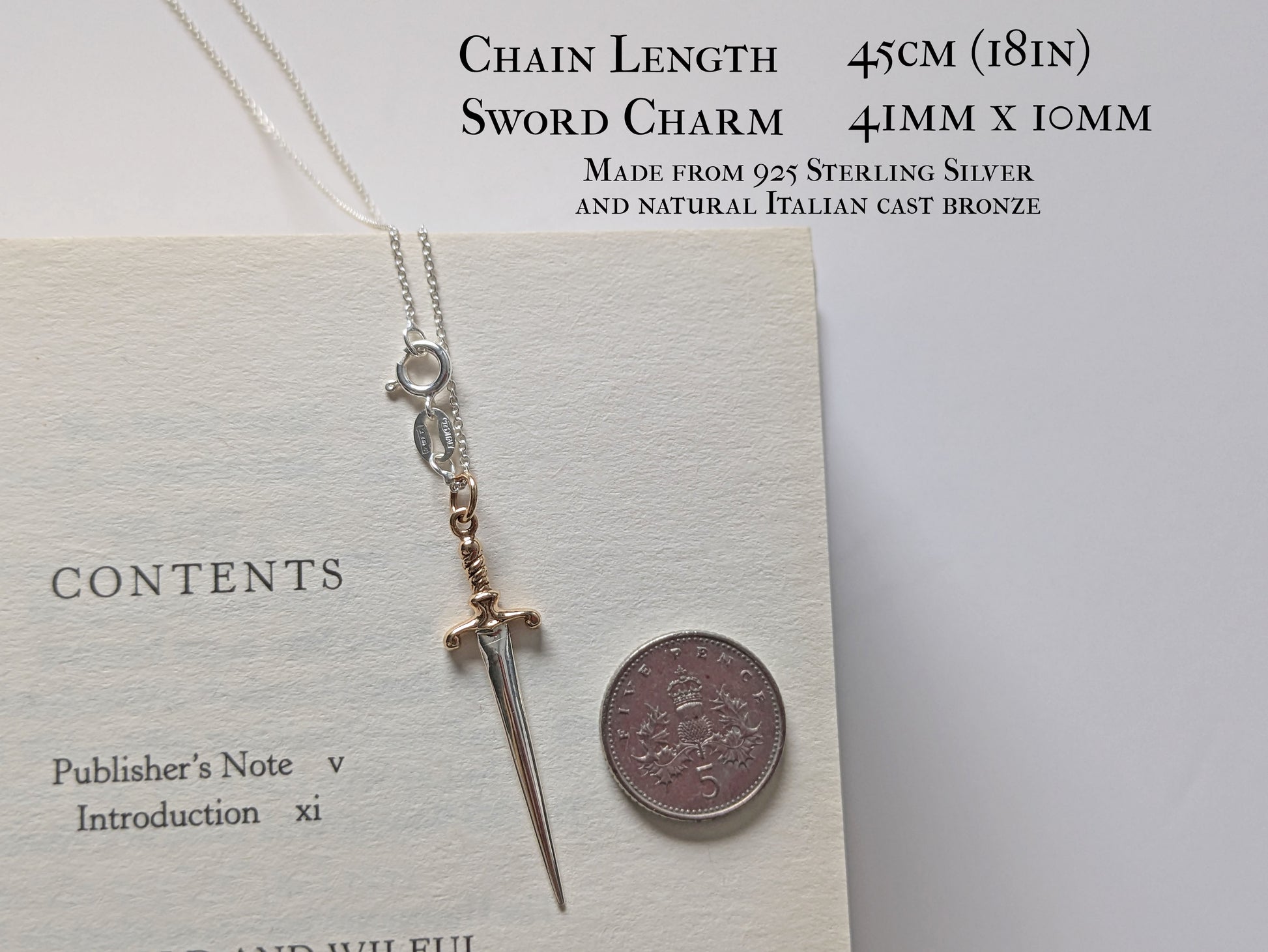 - Sword charm is made from a combination of stamped 925 sterling silver and solid bronze