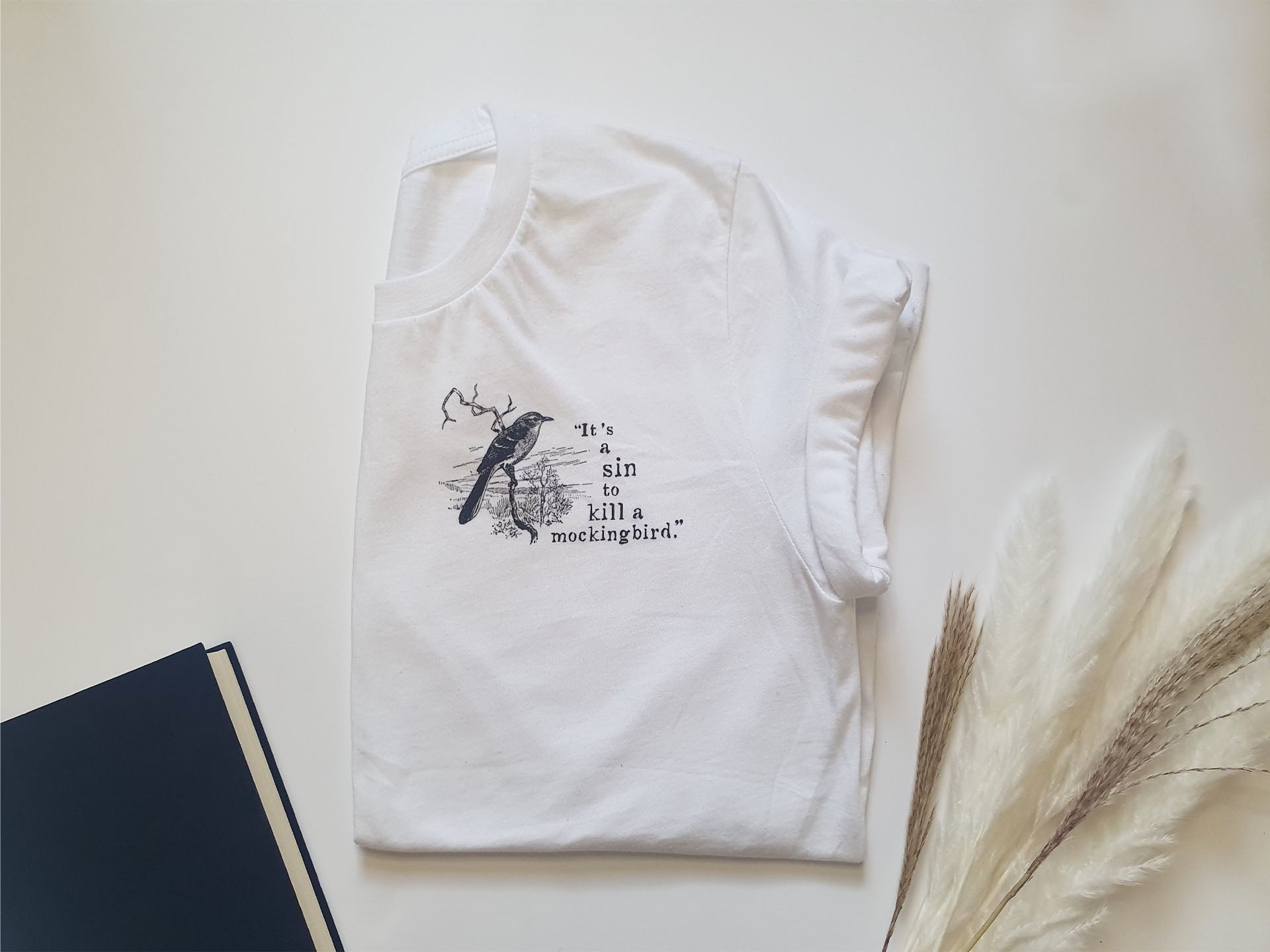 Embrace the wisdom of Harper Lee's masterpiece with our To Kill a Mockingbird literary T-shirt. Inspired by justice, this shirt is a must-have for fans of classic literature and those captivated by courage.