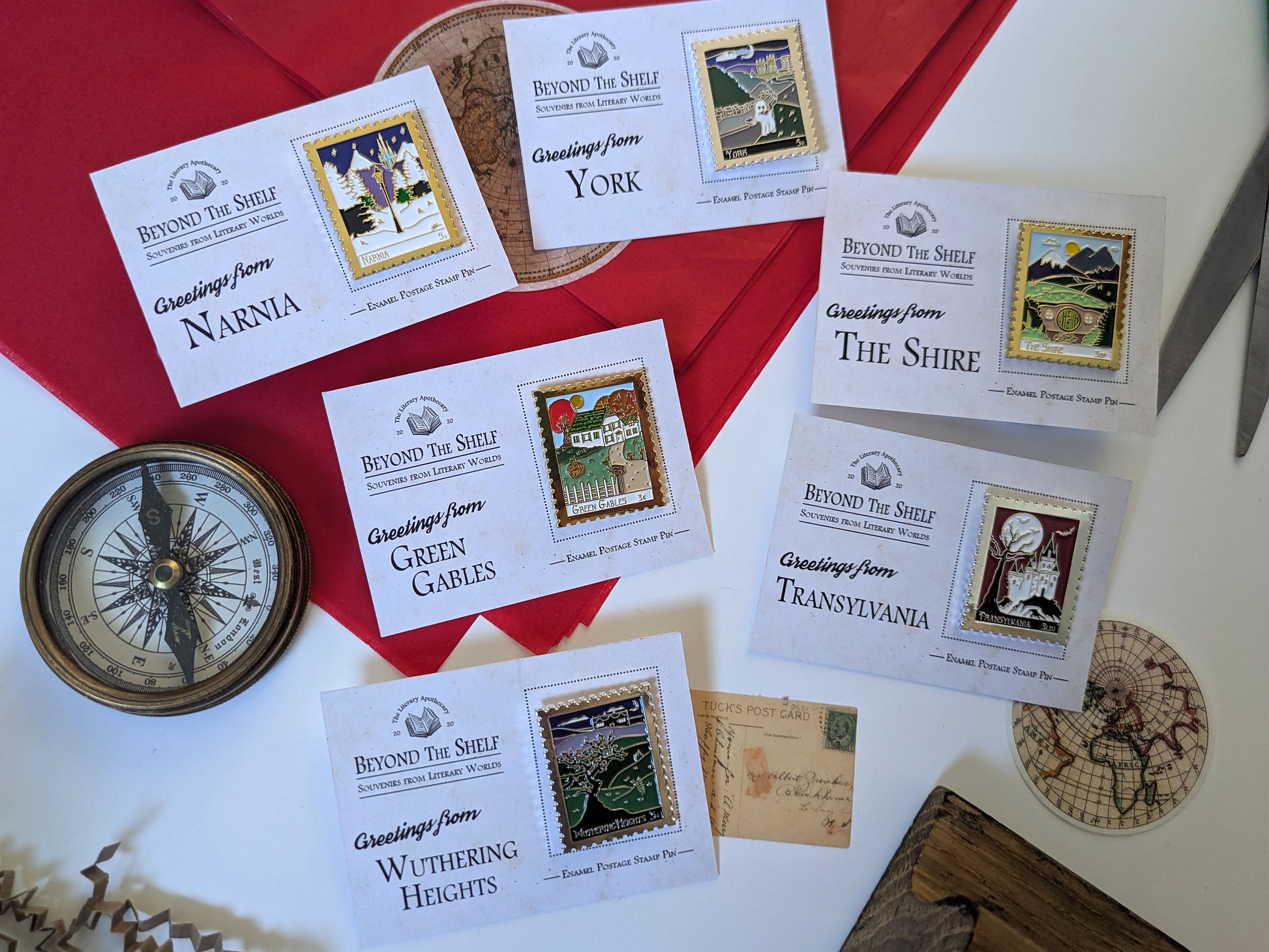 Beyond the Shelf pin badges are the best way to carry a piece of your favourite book with you wherever you go. Framed in the style of a traditional postage stamp, our Souvenirs from Literary Worlds pins are classic keepsakes for book lovers to collect from the exciting and comforting worlds they escape to on their reading journeys.